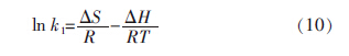 通過Gibbs 方程計算吸附自由能(ΔG)、吸附焓變(ΔH)及吸附熵變(ΔS),以分析溫度對活性炭纖維吸附酸性品紅的影響〔14〕。由ΔG=-RTlnk1=ΔH-TΔS,得到: