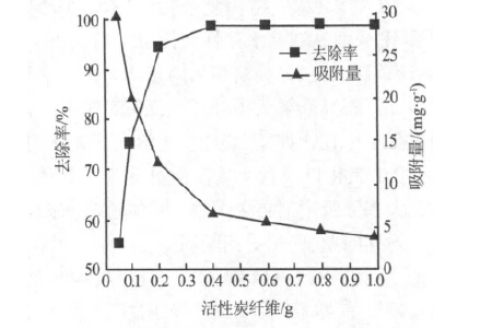 吸附劑的投加量是一個重要參數,它決定了吸附劑對吸附質的吸附容量。為確定適宜的投加量,分別投加0.05、0.1、0.2、0.4、0.6、0.8、1.0 g 活性炭纖維,對50 mL 質量濃度為50 mg/L 的酸性品紅溶液進行吸附,結果如圖 1 所示。