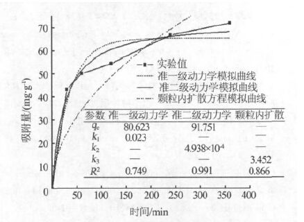 吸附過程的動力學可通過動力學模型〔式(6)、(8)、(9)〕對吸附飽和前數據進行擬合描述,從而推斷其吸附機理。用Microcal Origin 軟件對3 種動力學模型進行模擬分析,相應曲線和動力學參數見圖 4。