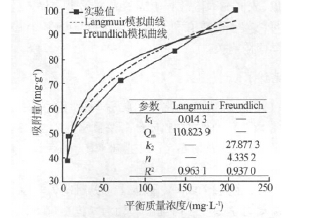 恒溫條件下固體表面發生的吸附現象,常用 Langmuir 和Freundlich 方程來表征其表面吸附量與介質中溶質平衡濃度之間的關系〔11, 12〕。