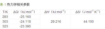 由表 1 可知:ΔG 均為負值,表明吸附過程是自發進行的,與等溫吸附特性研究結論一致,而且ΔG 隨溫度的升高呈增加趨勢;ΔH 為正值表明吸附過程本身是吸熱的,說明高溫有利于吸附的進行;ΔS 為正值,表明在吸附過程中固液界面無序,混亂度較大,可能與升溫更有利于活性炭纖維與酸性品紅發生化學吸附有關。具體參見http://www.xhxdt.com更多相關技術文檔。