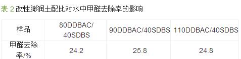 確定陰離子表面活性劑用量為40SDBS,改變陽離子表面活性劑的用量,在相同條件下進行實驗,發現改性膨潤土的吸附性能與陰陽離子表面活性劑的配比有關,見表 2。