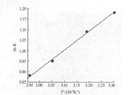 歸方程( 見圖 1),其熱力學模型為ln K=899.6/T- 1.786 1(R=0.997 9)。由回歸方程直線的斜率和截距可求得ΔH=-7.48 kJ/mol,ΔS =-6.45 J/(mol·K),而 25 ℃下ΔG=-5.53 kJ/mol。在所研究的溫度范圍內,該吸附反應ΔG<0,能自發進行;同時ΔH<0,說明該吸附反應放熱,溫度升高對吸附不利。