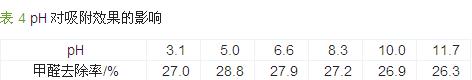 由表 4 可見,廢水由較強的酸性變至較弱的酸性時,去除率明顯增加。當pH 為5.0 時,甲醛去除率最大,為28.8%,此后隨pH 增加,去除率緩慢下降。這是由于pH 較高時,易破壞溶液中甲醛的離解平衡,使離子化甲醛的數量增多,而離子態甲醛因極性較大會使其被吸附的數量減少,因此去除率下降〔7〕。可見,pH 也會影響改性膨潤土對甲醛的吸附性能。