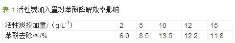在微波功率為13.2 W、輻照時間5 min 的條件下,考察活性炭投加量對苯酚降解率的影響,見表 1。從表 1 可見,理想的活性炭投加量為10 g/L。
