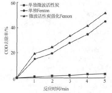 由圖 3、圖 4可以看出:采用單獨活性炭微波輻照5 min 時,苯酚去除率僅為13.5%,COD 去除率僅為3.3%,并且微波輻照時間對苯酚廢水降解影響不顯著,隨輻照時間的延長,苯酚和COD 去除率變化幅度很小;單獨采用Fenton 試劑氧化苯酚廢水時,隨著反應時間的延長,苯酚和COD 去除率呈上升趨勢,反應5 min 后苯酚去除率66.7%,COD 去除率為44.6%; 而采用微波活性炭輔助Fenton 試劑處理苯酚廢水時,相同時間內苯酚和COD 的去除率都高于單獨的Fenton 試劑處理效果,反應5 min 后苯酚去除率達到80%以上,COD 去除率達到50%以上,10 min 后苯酚去除率可達97%以上。由此可見,微波對Fenton 試劑處理苯酚廢水具有協同強化作用。