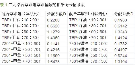 在前人的研究基礎上選用高沸點的三烷基胺(7301)、磷酸三丁酯(TBP)為絡合萃取劑,煤油、甲苯為稀釋劑,針對醋酸稀溶液篩選合適的絡合萃取劑〔4, 5〕,結果見表 1。