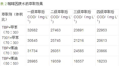 由表 1 可以看出,在同一組萃取劑混合體系中,隨著絡合劑用量的增加,分配系數增大。選擇萃取醋酸稀溶液效果較好的萃取劑對咖啡因廢水進行萃取,結果如表 2 所示。