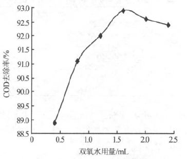 通過實驗考察了雙氧水用量對COD 去除率的影響,結果見圖 2。由圖 2 可見,隨著雙氧水用量的增加,COD 去除率逐漸增加,雙氧水>1.6 mL 時,COD去除率反而下降,實驗中確定雙氧水用量為1.6 mL。