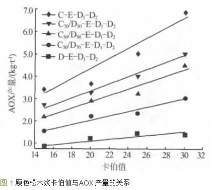 從圖 1 可以看出:在各種漂白工藝中,AOX 的產(chǎn)生量都是隨著漂白工藝中卡伯值的增大而增加。DE-D1-D2漂白工藝中AOX 的產(chǎn)生量隨卡伯值增加的幅度最小,而C-E-D1-D2漂白工藝中AOX 的產(chǎn)生量隨卡伯值增加的幅度最大。反應在圖 1 中就是前者的直線斜率最小,而后者最大。