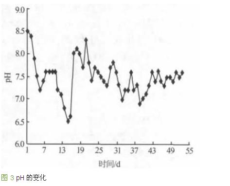 由圖 3 可以看出,由于進水COD 較高,有機酯水解產生的馬來酸、亞磷酸等物質累積后直接引起pH 迅速下降,pH 由開始時的8.5 左右,在第15 天時下降到6.5 左右。同時,出水中并沒有檢測到VFA的積累,出水VFA 始終在100 mg/L 以下,說明pH的下降并不是由于VFA 的積累所造成的。啟動第17 天,在保持進水堿度不變的情況下,通過降低有機負荷以及延長HRT 等方式,系統pH 迅速由6.5回升到7.0 以上。在此期間,在進水COD 沒有明顯變化的情況下,COD 去除率由25%迅速上升到了70%以上。穩定后的出水pH 維持在7.4~7.6,表明系統內呈微堿性狀態,這與其他酯類廢水厭氧處理實驗結果相吻合。