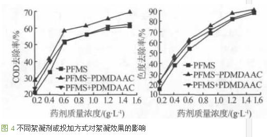 由圖 4 可以看出,在相同投藥量下,PFMSPDMDAAC對垃圾滲濾液的絮凝效果始終保持最佳,其COD 去除率和色度去除率明顯高于PFMS 或PFMS+PDMDAAC 這種投加方式,顯示了PFMSPDMDAAC對垃圾滲濾液具有良好的絮凝性能,亦驗證了復合絮凝劑中PFMS 和PDMDAAC 兩者產生了明顯的協同作用。