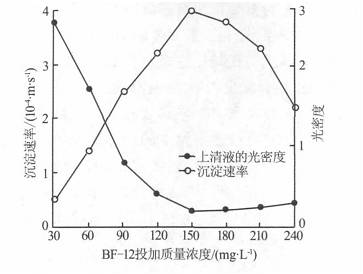 由圖2可知,當絮凝劑投加質量濃度為150mg/L時,絮凝效果最佳,此時沉淀速率為4×10-4m/s,光密度為0.20。隨著絮凝劑投加量的繼續增加,沉淀速率反而減小,光密度逐漸升高。因為BF-12的主要成分為高分子多糖,膠體、懸浮物顆粒與高分子化合物的極性基團或帶電荷集團結合,可形成體積龐大的膠體沉淀物。同時大分子物質的極性基團很多,在短時間內與多個顆粒結合,因此形成凝聚體速度快,絮凝作用明顯。但絮凝劑投加量過大,絮凝劑本身的極性基團或帶電荷集團會被保護起來無法與膠體、懸浮物顆粒結合,反而使絮凝性能下降。