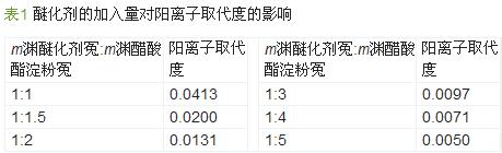 在醋酸酯陽離子兩性淀粉的合成中,醚化劑3-氯-2羥丙基三甲基氯化銨的加入量對陽離子取代度影響較大。取醋酸酯淀粉25g,反應時間6h,反應溫度40℃,pH為11,改變m(醚化劑)∶m(醋酸酯淀粉),考察其對醋酸酯陽離子兩性淀粉的陽離子取代度的影響,結果如表1所示。