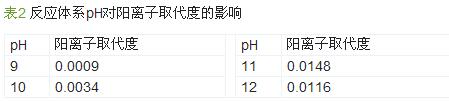 由表2可見,隨著反應體系pH的升高,陽離子取代度升高,尤其是當pH由10升高到11時,陽離子取代度急劇上升,由0.0034變為0.0148,這是由于當反應體系的pH升高時,淀粉被活化,反應效率提高,另外陽離子醚化劑3-氯-2羥丙基三甲基氯化銨在堿性較高的體系中有利于形成正離子,便于陽離子醚化反應。但當反應體系pH升到12時,體系的黏度急劇上升,難以攪拌,不能進行理想的醚化反應,陽離子取代度有所下降。所以反應體系pH=11為最佳。