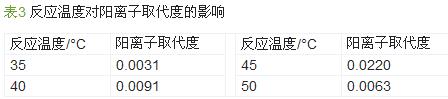 由表3可見,隨反應溫度的升高,陽離子取代度先增大后減小,在45℃時達最大值0.0220。這是因為在較低的反應溫度下,淀粉活化程度不高,因此反應效率也偏低;但若反應溫度較高,雖然淀粉的活化程度較高,但是醚化劑3-氯-2羥丙基三甲基氯化銨不穩定,影響反應效果,因此產品取代度也不高。綜合考慮,取45℃為最適反應溫度。