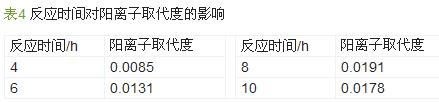 由表4可見,反應時間為4~8h,取代度增加較多;但當反應時間長于8h后,產品的陽離子取代度有所降低,這可能是由于醚化劑3-氯-2羥丙基三甲基氯化銨長時間揮發較多,影響反應的結果。