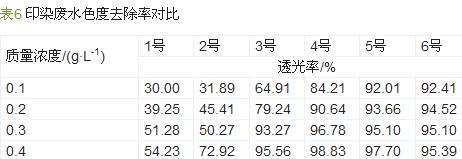 取不同陽離子取代度的醋酸酯兩性淀粉(陰離子取代度都為0.0745),分別編號為1~6號:陽離子取代度分別為0.00089、0.0050、0.0085、0.0131、0.0200、0.0413,按上述方法進行印染廢水脫色實驗,結果如表6所示。