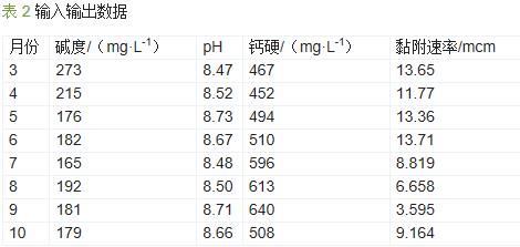 目前國內循環水系統主要監測的水質項目見表 1。由于循環水中的結垢成分主要是CaCO3,因此在這些監測項目中,堿度、鈣硬、pH 是影響結垢的主要指標。以某石化公司2010 年3—10 月的數據為依據,選取堿度、鈣硬、pH 作為輸入,輸出為黏附速率,根據循環冷卻水節水控制規范,黏附速率控制指標為不大于15 mcm。首先選取滿足水質控制指標的數據,對輸入數據進行預處理即數據的歸一化處理〔3, 4〕。輸入數據的頻率為每天1 次,輸出數據的頻率為每月1 次,對輸入數據進行均值化處理,處理后的部分數據見表 2。