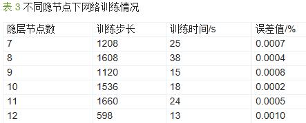 分別將隱節點設為7~12,進行網絡訓練,綜合訓練步長、訓練時間和誤差的情況,最終確定隱節點數為10。不同隱節點數下網絡訓練情況如表 3 所示。
