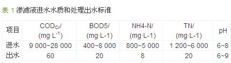 該垃圾填埋場采用厭氧填埋工藝,滲濾液水質波動幅度大、濃度高且可生化性較差,根據建設方提供的水質數據,并結合其他相似工程的進水水質狀況〔1, 2〕,對滲濾液處理站進水水質采取保守設計;同時,要求處理后的出水水質達到《生活垃圾填埋場污染控制標準》(GB 16889—2008)相應標準,其主要指標的進水水質及出水標準見表 1。