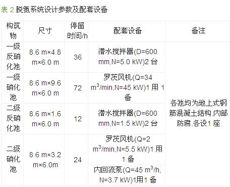 考慮滲濾液高氨氮的水質特點,設計反硝化前置的兩級硝化反硝化脫氮系統,滲濾液重力自流依次通過由一級反硝化池、一級硝化池、二級反硝化池、二級硝化池串聯組成的脫氮系統,各池參數及配套主要設備見表 2。