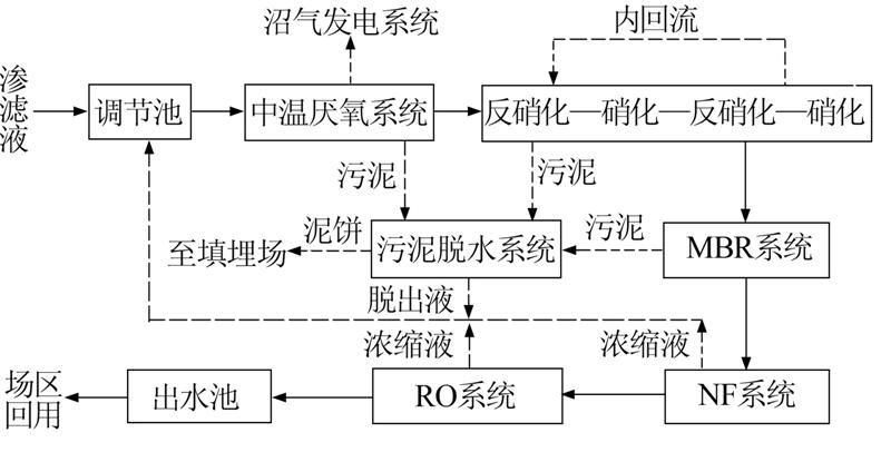 來自垃圾填埋場的滲濾液自流進入調節池,在調節池中均化水量水質;之后,由潛污泵提升進入中溫厭氧反應器,可分解滲濾液中的大部分有機物,CODCr、BOD5得到初步降解,并提高滲濾液的可生化性;出水自流進入兩級脫氮系統,經過反硝化—硝化—再反硝化—再硝化的系列反應,將水中高濃度的氨氮轉化為硝態氮最后轉化為氮氣排除,同時有機物也得到大幅降解(為提高脫氮效果,設置硝化液回流系統);完成脫氮的滲濾液自流進入浸沒式MBR系統,通過MBR系統中生物降解和膜過濾的綜合作用,進一步去除滲濾液中難降解有機物及大部分懸浮物,以滿足NF系統的進水要求;MBR出水經自吸泵輸入NF系統,將大部分CODCr、BOD5、二價離子及色度截留;NF系統后設置反滲透系統,濾除納濾系統無法截留的一價鹽離子以及剩余的氨氮、CODCr、BOD5等污染物,同時將滲濾液色度進行脫除。出水水質優于《生活垃圾填埋場污染物控制標準》(GB 16889—2008),可將其回用于場區除塵等雜用用途。
