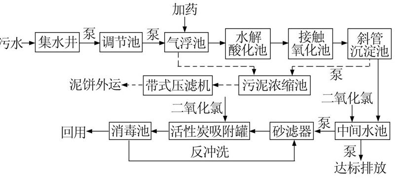 廠區(qū)生產(chǎn)生活廢水經(jīng)過廠區(qū)排水管網(wǎng)收集后輸送至廢水處理站,廢水經(jīng)提籃格柵去除水中的大塊物質(zhì)后進入集水井。集水井廢水經(jīng)泵提升后,經(jīng)過機械格柵進入調(diào)節(jié)池,機械格柵的作用是去除廢水中的漂浮物、細(xì)小顆粒懸浮物及毛發(fā)等。調(diào)節(jié)池廢水經(jīng)泵提升后進入氣浮池,廢水中的懸浮物及膠體類物質(zhì)經(jīng)絮凝反應(yīng)及氣浮作用后形成浮渣,就近重力流入污泥濃縮池,與生化剩余污泥一起進行機械脫水處理。氣浮出水流入水解酸化池,通過水解酸化作用提高廢水的可生化性。水解酸化池出水流入接觸氧化池,進行好氧生化反應(yīng),去除廢水中大多數(shù)有機污染物。接觸氧化池出水流入斜管沉淀池,沉淀污泥由污泥泵打入污泥濃縮池,上清液進入中間水池。