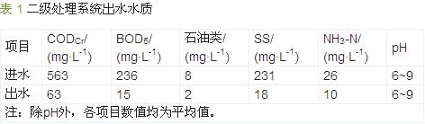 該廠廢水總排放量為1 500 m3/d,其中1 000 m3/d的二級出水水質(zhì)執(zhí)行《污水綜合排放標(biāo)準(zhǔn)》(GB 8978-1996)的一級標(biāo)準(zhǔn),500 m3/d的中水出水水質(zhì)執(zhí)行《城市污水再生利用 城市雜用水水質(zhì)》(GB/T 18920-2002)的再生水回用水質(zhì)標(biāo)準(zhǔn)。該廠產(chǎn)生的廢水水質(zhì):CODCr≤550 mg/L,BOD5≤250 mg/L,石油類≤10 mg/L,SS≤250 mg/L,NH3-N≤30 mg/L,pH 6~9。