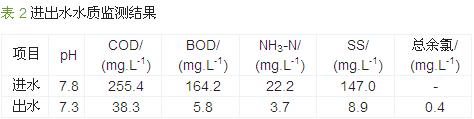 該系統穩定運行3個月后,對進水、出水各隨機取樣10次,其污染物濃度平均值如表 2所示,檢測依據國家標準方法進行〔4〕。