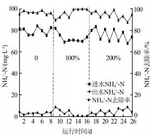 在混合液內回流比分別為0、100%和200%的工況條件下,分段進水循環A/O工藝對NH4+-N的去除效果如圖 3所示。