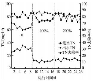 從圖 4可以看出,當混合液內回流比分別為0、100%、200%,進水TN平均分別為82.11、75.53、78.46 mg/L時,出水TN平均分別為29.75、11.30、13.52 mg/L,對應的平均TN去除率分別為63.77%、85.03%和82.77%.實驗所用污水碳氮比平均為4.4,屬于低碳氮比生活污水,但當混合液內回流比為100%和200%時,出水TN平均分別為11.30 、13.52 mg/L,均小于15 mg/L,滿足《城鎮污水處理廠污染物排放標準》(GB 18918-2002)的一級A標準,說明系統對碳源有一個較高的利用效率,反硝化效果較好。