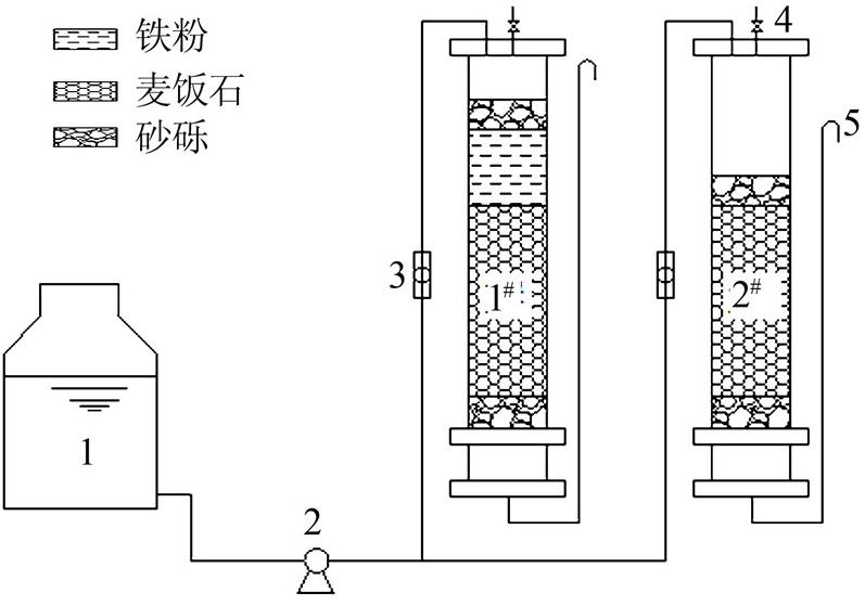 采用2個內徑55 mm、高450 mm的有機玻璃管作為土柱反應器(分別記為1#柱、2#柱),柱子上下兩端各裝填20 mm高、粒徑為5~10 mm的砂礫保護層。1#柱在砂礫保護層之間由下往上依次裝填高200 mm、粒徑0.25~0.60 mm的麥飯石及高100 mm、粒徑0.60~2.0 mm的鐵屑,2#柱在砂礫保護層之間僅裝填與1#柱等量的麥飯石。各柱的出水口均高出柱內填料上表面約30 mm,避免柱內形成短流。試驗過程中用流量計控制水力負荷為0.1 m3/(m2·d).試驗裝置見圖 1。