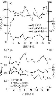 1#、2#柱對煤礦礦井水中Fe2+、Mn2+、SO42-、COD的去除效果如圖 3所示。