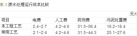 本工程廢水處理運(yùn)行成本主要包括電費(fèi)、人工費(fèi)、藥劑費(fèi)、污泥處置費(fèi)等,其與常用處理工藝(混凝沉淀-水解酸化-好氧-混凝沉淀)的運(yùn)行成本比較見表 3。