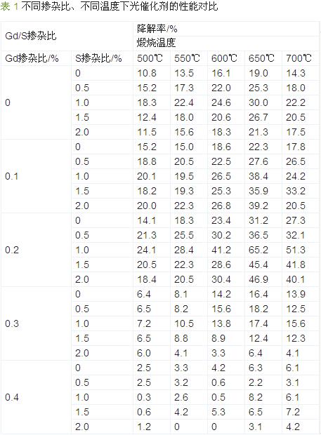 (1)釓元素摻雜的TiO2,當釓元素的摻雜比小于0.2%時,能提高TiO2的光催化性能。當釓摻雜比大于0.3%時,光催化效果反而降低。當釓的摻雜比小于0.2%時,相對于釓或硫單元素摻雜的TiO2,釓、硫共摻雜TiO2的光催化性能進一步提高。
