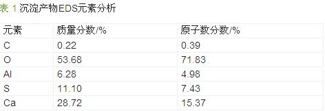 將pH=11,n(Al3+)∶n(SO42-)=0.575條件下得到的沉淀物分別用掃描電子顯微鏡(SEM)和X射線能譜儀(EDS)進行表征,結果分別如圖 1、表 1所示。