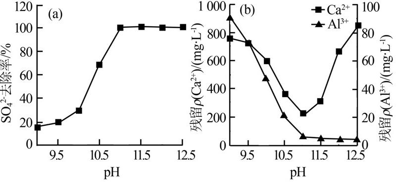 實驗結果表明,當pH≤10.0時,SO42-去除率較低,主要沉淀物為CaSO4;隨著pH的進一步升高,〔Al( OH)6〕3-八面體逐漸生成,并結合Ca2+和SO42-形成鈣礬石沉淀,SO42-去除率升高;當pH>11.0時,SO42-去除率的變化不大。