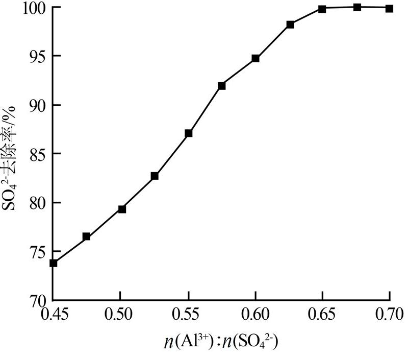 由圖 3可知,當n(Al3+)∶n(SO42-)<0.65時,隨著鋁鹽投加量的增加,SO42-去除率顯著增大;當 n(Al3+)∶n(SO42-)=0.575時,SO42-去除率已達到90%以上。從工程實際成本考慮,鋁鹽投加量不宜過量太多,以n(Al3+)∶n(SO42-)=0.575為最佳。