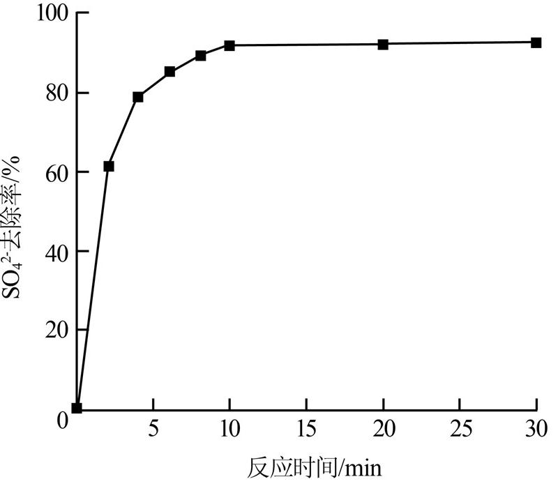 在n(Al3+)∶n(SO42-)=0.575,pH=11.0,攪拌速度為300 r/min的條件下,考察了反應時間對SO42-去除率的影響,結果如圖 4所示。