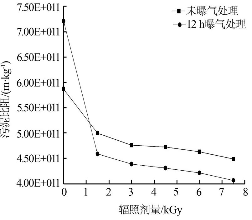 (2)未曝氣組和曝氣組不同輻照劑量下污泥比阻的變化表明:隨著輻照劑量的增大,污泥比阻降低,污泥脫水性能隨之改善;經(jīng)過曝氣處理,能進(jìn)一步提升污泥脫水性能。