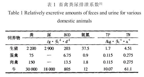 畜禽業是我國農業和農村經濟的重要組成部分,畜禽養殖業大力發展所帶來的環境污染問題日益嚴重, 不僅影響經濟發展, 而且還危及生態安全, 已成為人們普遍關注的社會問題。畜禽養殖場產生的糞便和污水造成地表水、地下水、土壤和環境空氣的嚴重污染, 直接影響了人們的身體健康和正常生產生活。畜禽養殖場未經處理的污水中含有大量污染物質, 其污染負荷很高, 各類畜禽糞尿排泄系數見表 1 。這種高濃度有機廢水直接排入或隨雨水沖刷進入江河湖庫 , 大量消耗水體中的溶解氧 , 使水體變黑發臭。水中含有大量的 N 、P 等營養物是造成水體富營養化的重要原因之一, 排入魚塘及河流使對有機物污染敏感的水生生物逐漸死亡, 嚴重者導致魚塘及河流喪失使用功能。養殖污水長時間滲入地下, 使地下水中的硝態氮或亞硝態氮濃度增高, 地下水溶解氧含量減少, 有毒成分增多, 導致水質惡化, 甚至喪失其使用功能, 同時危及周邊生活用水水質。高濃度污水還可導致土壤孔隙堵塞, 造成土壤透氣、 透水性下降及板結、鹽化, 嚴重降低土壤質量, 甚至傷害農作物 , 造成減產和死亡。