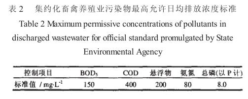 為控制畜禽養殖業產生的廢水、廢渣和惡臭對環境的污染, 國家環境保護總局發布了《 畜禽養殖業污染物排放標準》, 著手治理畜禽養殖場和養殖區的污染難題。這一標準旨在鼓勵生態養殖, 推動畜禽養殖業可持續健康發展; 促進畜禽場在廢棄物處理過程中考慮資源化利用, 減少末端污染物處理量。畜禽養殖業污染物排放標準見表 2 。