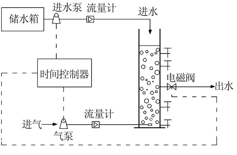 實驗中R1、R2均為SBR反應器,由有機玻璃制成,如圖 1所示。反應器有效高度為100 cm,內徑7 cm,有效體積2 L,排水口設在距反應器底部26 cm處,排水量為1 L,即換水比為50%。反應器底部設有曝氣頭,由空氣泵供氣并用轉子流量計控制曝氣量,曝氣量控制采取遞增模式,由0.1 m3/h逐漸增加并最終穩定在0.4 m3/h,相當于表面氣速為2.89 cm/s。人工模擬廢水裝入儲水箱由小型抽水泵抽吸并從上部進入SBR反應器。反應器中部設置有排水口,由電磁閥控制排水。SBR反應器運行周期4 h,進水3 min、曝氣227 min、沉降5 min、排水5 min,整個運行過程由時間繼電器自動控制。溫度由電熱帶和溫控儀共同控制在(24±1) ℃。