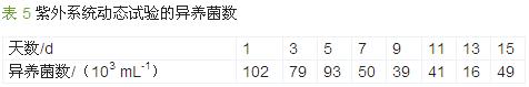 第 2 套系統在動態試驗啟動的第 2 天啟動紫外殺菌,水中異養菌數隨時間的變化情況見表 5。