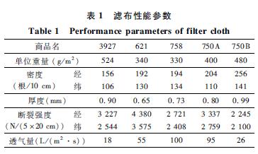 5種濾布(3927、621、758、750A、750B)用于滲透實驗過濾材料,其性能參數見表1。3種表面活性劑用于改性濾布,分別為織物平滑劑,灰白色均質半透明液體,固含量30%,來自東莞市澳達化工有限公司;毛毯柔軟劑,淺黃色粘稠液體,型號XY129,有效物含量100%,來自蘇州勛云化工有限公司;氟表面活性劑,琥珀色透明液體,型號Ee602,有效成分含量27%,來自上海久士城化學有限公司。