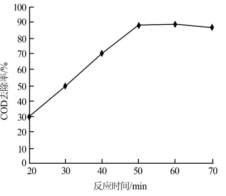 由圖5可知,隨反應時間的增加,COD去除率不斷增加。在反應進行到50 min時,COD去除率最高,達到88%。超過50 min后COD去除率基本不再變化,甚至有所降低。其原因是,反應時間延長可使電極反應的產物與廢水中污染物進行充分的電化學、吸附及絮凝等作用。但是反應時間過長會使更多的Fe2++被氧化成Fe3++,使色度增加,反應時間過長也會導致廢水中沉積物沉積在填料之間的空隙中,覆蓋于鐵和炭表面,阻礙了兩者的接觸,抑制反應的進行。而且反應時間的延長,會使反應器的容積增加、建筑面積增加,基建費用和設備投資費用增加。因此將最佳反應時間定為50 min。