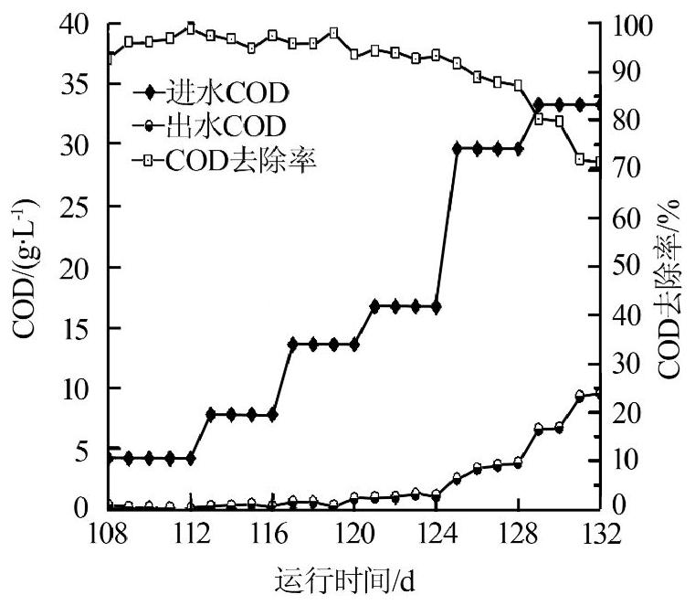 從圖4可知,當(dāng)進(jìn)水COD小于30 g/L時(shí),COD去除率可高達(dá)88%以上,一級(jí)出水可控制在4 g/L以下。但當(dāng)進(jìn)水COD提高到33 g/L時(shí),出水COD逐漸升高,去除率下降,在此條件下運(yùn)行至第4天時(shí),反應(yīng)器出水pH降至5.6,反應(yīng)器出現(xiàn)酸化現(xiàn)象。進(jìn)水COD為33 g/L時(shí),對(duì)應(yīng)的反應(yīng)器容積負(fù)荷(以COD計(jì))為35 kg/(m3·d),當(dāng)厭氧反應(yīng)器容積負(fù)荷大于29 kg/(m3·d)時(shí),處理效果便會(huì)有所下降,再升高便有可能導(dǎo)致處理效果急劇下降,出水VFA積累,導(dǎo)致反應(yīng)器酸化[10]。所以,當(dāng)反應(yīng)器容積負(fù)荷大于29 kg/(m3·d),需調(diào)節(jié)進(jìn)水流量以控制反應(yīng)器容積負(fù)荷在微生物可接受范圍。