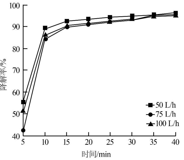 由圖4可知,在選擇的3個臭氧投加量范圍中,并不是臭氧投加量越大PAP的降解率越高,臭氧投加量為50 L/h反而降解率最高,其次為100 L/h。原因可能是雖然臭氧投加量增加了其在溶液中的溶解度和反應接觸面積,但是在攪拌作用下,同時加速了臭氧氣體的逸出,減少臭氧與反應物的接觸時間,導致臭氧不能與反應物充分接觸反應,所以降解率有所下降。