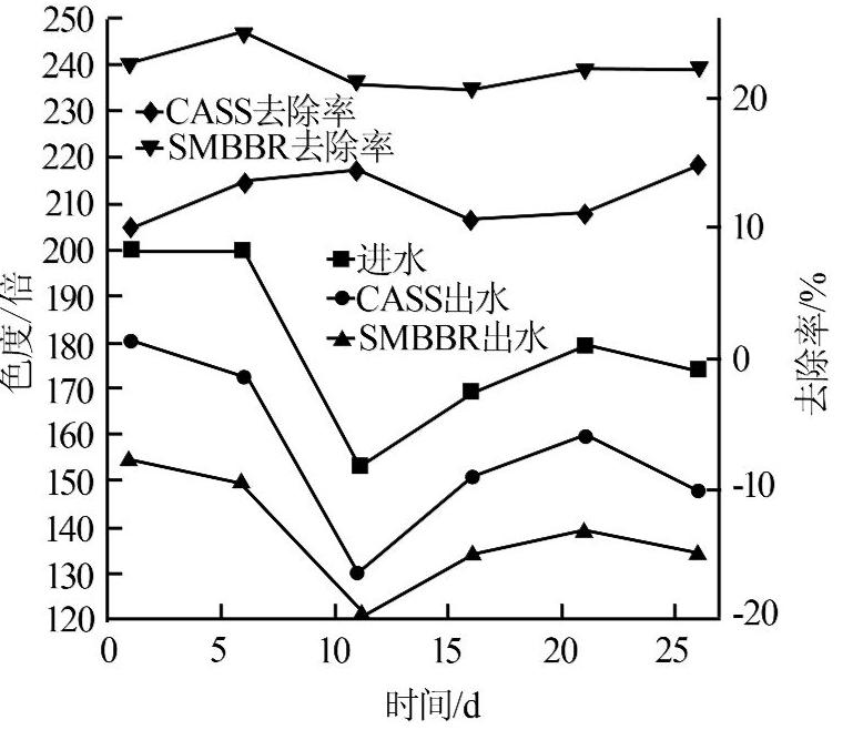 圖5 CASS和SMBBR工藝對色度的去除效果